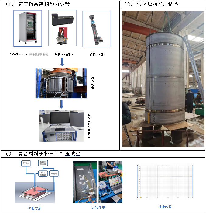 静力试验方面,自主建设多通道静力自动协调加载试验系统和内外压强度试验系统。多通道静力自动协调加载试验系统由4通道MOOG控制器、油源与分油子站、伺服作动器,静力加载台架和数据采集系统组成,静态控制精度优于0.5%FS,动态控制精度优于2%FS,疲劳试验最高加载频率20Hz,用于观测和研究试验件结构的零部件在静荷作用下的强度、刚度、稳定性以及应力、变形的分布情况。目前,静力试验方面已完成液体探空火箭的贮箱强度试验(水压1.2MPa)、蒙皮桁条舱段强度试验、发动机机架强度与刚度试验、常平座疲劳试验和电缆罩外压试验。