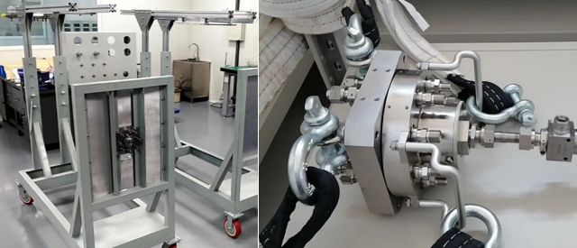 面向无人值守和简化箭地发射(去勤务塔模式)要求,自主设计高可靠0秒气脱连接器、加注连接器和主动撤收装置机构,其中0秒气脱连接器,可满足6-12路供气需求,单路最高气压23Mpa。通气自动分离,分离路气压17-23Mpa。主体材质采用Ocr18Ni9,防锈防腐蚀。