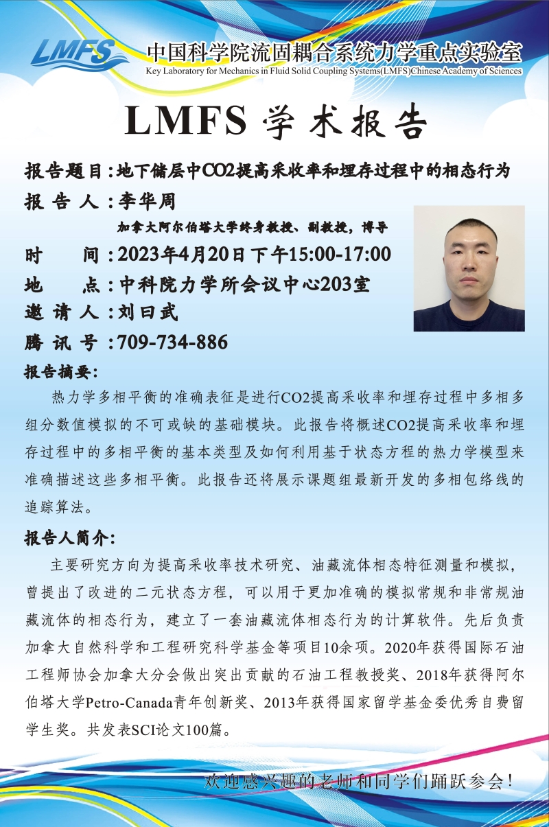 (LMFS学术报告4月20日15:00Q彩网会议中心206会议室&腾讯会议709 734 886)地下储层中CO2提高采收率和埋存过程中相态行为