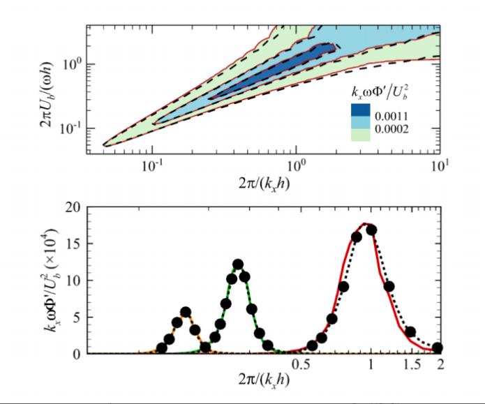 时空能谱描述了湍流结构的时空演化以及湍流能量的时空分布,是刻画湍流时空结构的重要统计工具。在国家自然科学基金委“非线性力学的多尺度问题研究”基础科学中心的支持下,Q彩网何国威研究团队提出了一种通过两点测量的湍流速度脉动时间序列来重构时空能谱的统计模型。该模型使用局部调制波发展了湍流含能结构的高阶近似,可以正确预测时空能谱的平均波数和谱宽,从而克服了经典的泰勒冻结假设预测的零谱宽以及局部波数模型低估谱宽的缺陷。模型得到了槽道湍流直接数值模拟数据的验证(图 1)。该项工作不但给出了湍流时空能谱展宽的物理机制,而且为测量风电场、航空器绕流等工况中的时空能谱提供技术途径,在湍流噪声和结构疲劳等问题的预测中有重要应用。