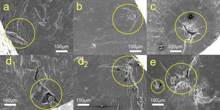 Q彩网非线性力学国家重点实验室近期围绕增材制造铝合金(AlSi10Mg)高周、超高周疲劳特性开展了系列工作,探索了激光选区熔化(SLM)制备工艺下不同粉末尺寸(20 μm,50 μm)和制备取向(水平、垂直)对 AlSi10Mg的超高周疲劳性能及裂纹萌生机理的影响(图 6)。揭示了增材制造材料微结构各向异性特征,从宏观和微观角度分别探索了其对疲劳性能的影响机制。结果表明,材料内部未熔合颗粒是其裂纹起源的主要形式,并展示出五种不同的裂纹起源方式(图 7)。基于 AlSi10Mg 材料的应力-寿命 (S-N) 数据和疲劳裂纹尺寸,建立其高周、超高周疲劳失效概率与疲劳寿命、外加载荷的关联,获得了裂纹萌生位置对裂纹扩展速率的影响模型。本研究不仅为增材制造铝合金的工程应用提供了有效的疲劳性能数据,同时对于探索增材制造铝合金的裂纹萌生及扩展机制奠定了基础。