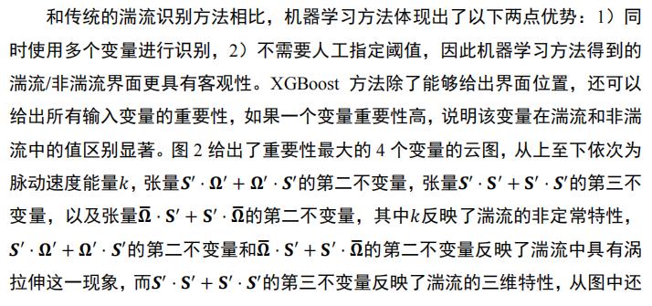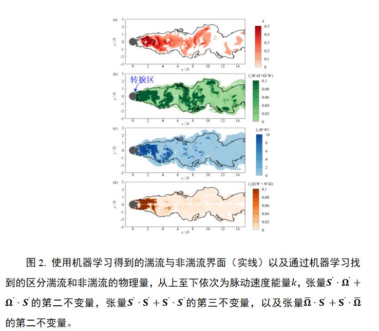 研究团队提出使用极端梯度提升法(XGBoost)算法对圆柱尾流(图1上)中的湍流/非湍流界面进行识别。XGBoost方法可以同时处理多个输入变量,为了得到与坐标系无关的识别模型,我们选择流动变量中的不变量作为模型输入,经过一系列湍流输运方程的推导,我们选择了平均运动的应变率张量和涡张量、脉动应变率张量、脉动涡张量、以及这些张量的二次张量的所有非平凡不变量,再加上脉动速度能量共计16个物理量作为输入变量进行模型训练。XGBoost方法属于机器学习中的监督学习方法,除了给出训练样本的输入变量外,还需要给出对应的流动状态,因此我们从流动状态已知的区域进行采样(图1下),训练完成后将模型用于全场,得到每一个离散点上的流动状态,从而得到湍流/非湍流界面(图2中的实线)。