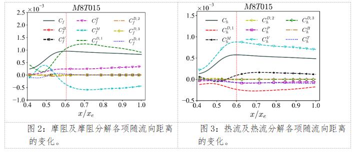 北京大学陈十一教授科研团队首次利用冯卡门边界层二次积分的方法对高超声速边界层转捩时壁面摩阻和热流的过冲现象的主要原因进行了解释。图2表示了转捩峰处摩阻的过冲现象主要由强烈变化的平均速度梯度导致,而之前文献中认为雷诺切应力是导致摩阻过冲现象的主要原因的论断是不合适的。图3表示了转捩峰处热流的过冲现象主要是由近壁处强烈的粘性耗散导致的,而之前文献中认为雷诺热流是导致热流过冲现象的主要原因的论断是不合适的。