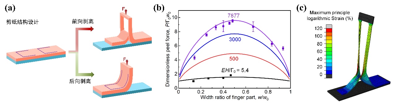 图13:(a) 软材料剪纸结构可控粘接设计方法;(b)界面失效过程中材料刚度变化时粘接峰值力与几何参数的关系;(c) 非线性材料本构描述的界面失效有限元分析。