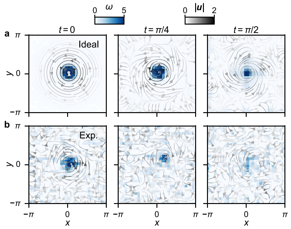 在量子真机实验方面,杨越课题组与浙江大学物理学院王浩华、宋超课题组合作,在超导量子计算机上首次实现了非定常流体动力学的端到端数字模拟实验[3]。该实验基于哈密顿模拟方法,使用了10个高保真度量子比特,对于可压缩渐扩势流和薛定谔涡流的结果定量预测了流动主要演化过程。特别是实验中将含特定源项的涡量动力学方程映射为线性双分量薛定谔方程,从而在薛定谔涡流的算例中包含了非线性涡动力学过程。而另一方面,由于目前量子计算机存在显著噪声,流场实验结果中显示出类似于湍流涨落的误差。该研究表明,尽管目前量子计算在初态制备、量子态演化和测量方面存在诸多挑战,但具有潜力模拟湍流等复杂流动。