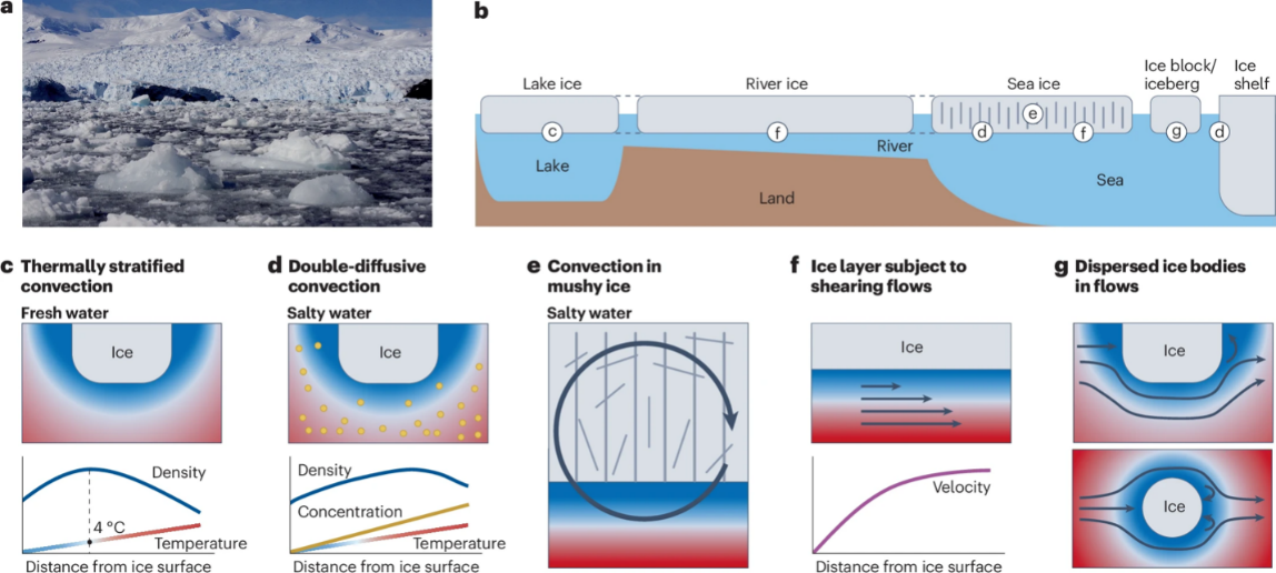 图1. (a) 南极的一个小型潮水冰川。(b) 典型的冰与水体流动的相互作用。(c) 冰层附近淡水的热分层流动。(d) 冰层附近咸水的双扩散对流。(e) 多孔咸水冰内部流动。(f) 沿冰层表面的剪切流动。(g) 绕有限尺寸冰体的剪切流动。