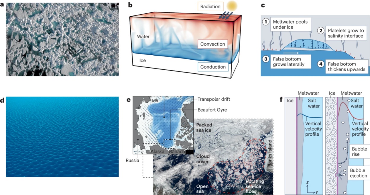 图2. (a) 夏季北极海冰表面的融池。(b) 融池内部自然对流温度场的直接数值模拟。(c) 冰下融池与海洋界面上假底的形成与增厚。(d) 冰山水下的“扇贝”图案。(e) 北冰洋西部边缘冰区的旋转浮冰。(f) 透明冰和冰川冰的融化过程中融水羽流的比较。