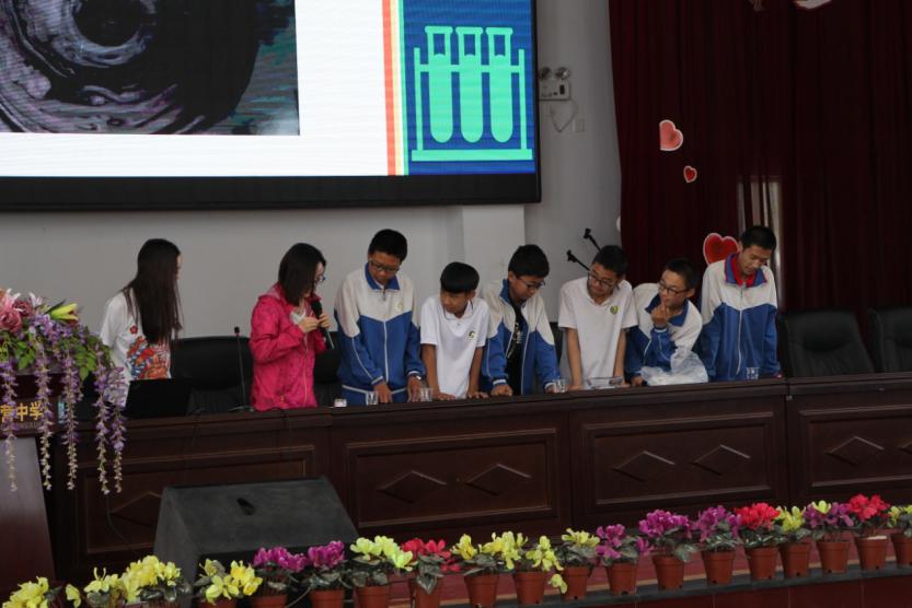 2016级硕士生汪也和硕博连读生苗青作了《表面张力的魅力》的主题报告,通过荷花出淤泥而不染、滴有墨水的牛奶在表面活性剂作用下向四周散开等实验向中学生介绍了表面张力的作用,也邀请同学参与表面张力的实验,向同学们解释了表面张力的原理,学生们对实验产生了很大的兴趣。