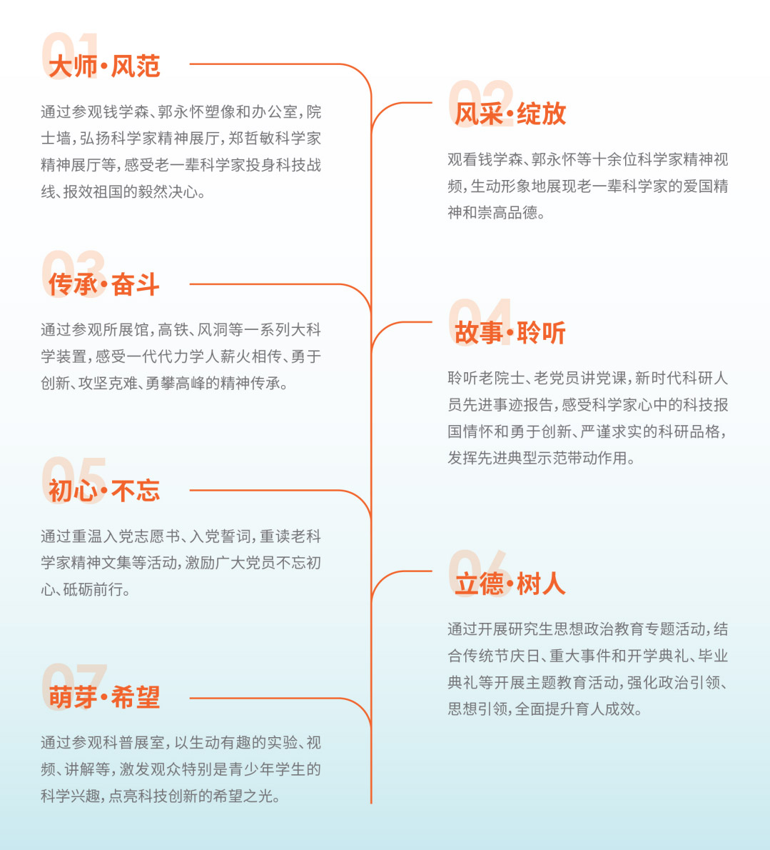 基地坚持所内所外共建共享、党建科研深度融合的理念,以“中关村园区”“怀柔园区”和“山东荣成”为空间维度,全方位开展主题教育活动。不断整合利用现有资源,构建并持续完善“七大模块“内容。