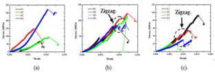 使用材料试验机对热处理前后的白云岩 石料样品进行压缩试验。结果如图 3 所示。 可以看出:由于石料样品采自砾石(和古人 类遗迹一致) ,材质的一致性差,因此力学 性能试验结果比较分散。但热处理后试验结 果的一致性有明显改善, 并且热处理后应力 - 应变曲线出现锯齿状波动现象,说明石料内 部存在多个“局部开裂”过程。