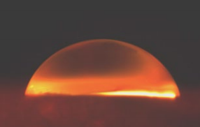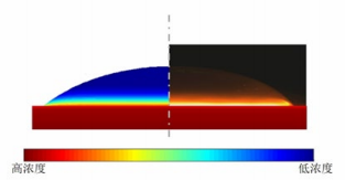 图 2 Ⅱ型溶解润湿液滴中的浓度场。图中液滴内部的 明暗代表浓度的高低, 液滴底部是可溶性的基底。溶质主要 经由气液界面向液滴顶部运输