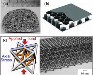 图 3 (a)泡沫金属材料,(b)蜂窝夹层材料,(c)拉压主导的点阵材料(图片来自于网络)
