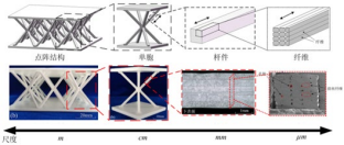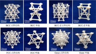 点阵结构的制备一直是研究的重点和难 点,传统的制备工艺主要有熔模铸造法、穿 孔冲压成型法和切割 - 嵌锁拼装法等。相较 于传统制备工艺,近年来快速发展起来的 3D 打印等增材制造技术,弥补了传统工艺中制 备周期长、点阵构型和杆件尺寸受限等问题, 越来越多地应用于点阵结构的制备上。然而, 采用 3D 打印技术一体化打印点阵结构也带 来了一系列新的问题,如打印完成后支撑材 料难以去除;打印过程带来的各向异性问题 使得点阵结构的力学性能显著降低;打印试 样的尺寸受到打印平台空间的限制等。为了 解决这些问题,我们将传统的嵌锁组装工艺 与 3D 打印技术相结合,将三维的点阵结构 降维成二维的杆件进行打印,通过对打印路 径的规划,成功地解决了打印过程中的各向 异性问题;将打印好的杆件组装成三维的点 阵结构,从而避免使用支撑材料,极大地降 低了打印成本和后处理(去除支撑材料)成 本。该方法不仅极大的提升了 3D 打印点阵 结构的力学性能,降低了打印成本,其模块 化的拼装方法亦可实现远超打印平台空间的 任意尺寸点阵结构的制备。图 4 为采用熔融 沉积成型(FDM)打印技术和嵌锁组装法制 备而成的点阵结构,从图中可以看出 , 使用 该方法制备的点阵结构实现了杆件内部的纤 维全部沿着杆件的长度方向分布这种最优状 态。图 5 是采用聚合物喷射成型(PolyJet) 技术和嵌锁组装方法相结合制备的四类不同 构型的点阵结构。