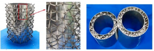 图 8 金属点阵柱壳结构 , (a) 嵌锁组装 + 真空钎焊金字塔型 点阵圆柱壳 [4] , (b) 方转圆异型点阵柱壳结构 [5]