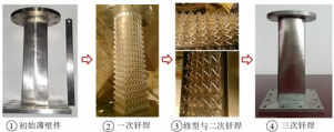点阵夹层柱壳结构除了具有较高抗弯刚 度、抑制裂纹拓展等力学性能上的优势之外, 其内部开放式周期分布的空间还为结构的多功能一体化设计提供了可能。因此,未来点 阵柱壳结构有望取代单层壳结构应用于一些 服役环境复杂的重要工程任务中。图 8(a) 是采用切割 - 嵌锁组装和真空钎焊工艺制备 的金属点阵夹层圆柱壳结构,首先我们采用 激光切割 304 不锈钢板,制备相应的点阵杆 件,然后采用嵌锁组装的方法形成相应的点 阵芯体结构, 再将点阵芯体套入内外圆柱壳, 最后采用真空钎焊工艺实现了点阵芯体节点 与内外壳的可靠连接。在现实应用往往面对 更为复杂、非等截面的柱壳结构,为了解决 不同界面形状之间的点阵柱壳的过渡转化问 题,我们采用冲压成型和真空钎焊工艺制备 了“方转圆”异形点阵柱壳结构。首先采用 冲压成型工艺制备出不锈钢点阵结构网络, 然后将点阵网络先与异形薄壁壳内壳焊接, 在对焊接完成后的点阵芯体进行形状修正和 二次钎焊之后,再对外侧壳体进行焊接,最 纵制备出“方转圆”异形点阵壳体结构。