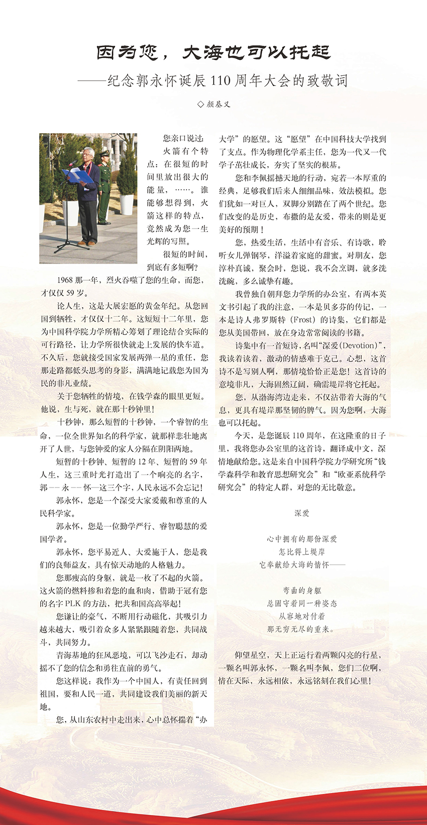 因为您,大海也可以托起——纪念郭永怀诞辰110周年大会的致敬词