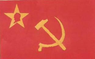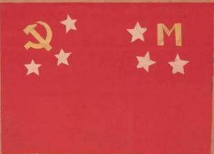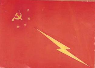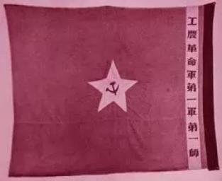 (左上角有金黄色五角星,其中有毛主席侧面剪影像,其中央有金黄色铁锤与镰刀, 意思为:中国工农劳苦大众解放,毛泽东百战百胜的旗帜)