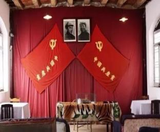 1921 年 7 月,在古城嘉兴南湖的游船上, 中国共产党第一次全国代表大会胜利结束。 当时,正值帝国主义和封建军阀实行反动统 治的黑暗时期,党的先驱者们还来不及将一 个崭新的革命党应具有的一切考虑周全,在留存下来的会议记录文件中,没有提及党的旗帜问题。次年 8 月,党的“二大”决定加入共产国际,于是,各地党组织各自模仿联共 ( 布 ) 党旗的式样自己制作,但具体规格式样不尽相同。1924 年 1 月到 1927 年 7 月,在共产国际帮助下,国共第一次合作,但当时出于形势要求,中国共产党并没有打出自己的旗帜,而是一直打着国民党的“青天白日旗”。