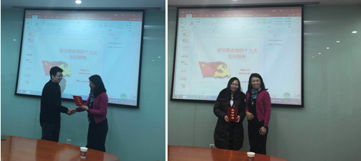 会议最后进行了推优评选工作,彭青、李少霞两位同志获得2017年度MAM党支部优秀共产党员称号,并由党委书记刘桂菊现场为两位同志颁发荣誉证书。