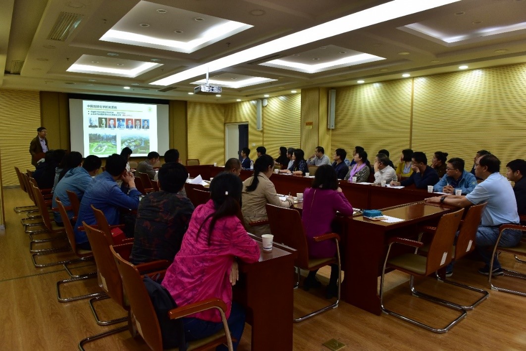 最后,大家来到中国科学院地球化学研究所开展参观交流,地化所党委书记、副所长(主持工作)冯新斌,党委副书记、纪委书记陈敬安,党支部书记,工会、党办等相关同志参加座谈。冯新斌向大家介绍了地化所的成立背景、人才队伍、学术成果、合作交流等方面的基本情况,并结合实验室布局和科研平台对研究所的发展规划进行了介绍。