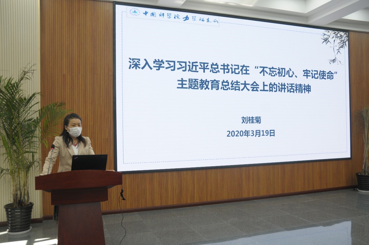 刘桂菊作了《深入学习习近平总书记在“不忘初心、牢记使命”主题教育总结大会上的讲话精神》主题报告,介绍了“不忘初心、牢记使命”主题教育总结大会情况,带领大家一同深入学习了习近平总书记在会上的重要讲话。刘桂菊强调,研究所党委要贯彻落实中央和院党组相关要求,结合研究所实际情况,坚持把政治建设摆在首位,大力加强理想信念教育,着力提升基层党组织组织力,切实抓好查摆出的问题特别是专项整治问题的整改落实,巩固深化“不忘初心、牢记使命”主题教育成效,推进主题教育常态化、制度化。