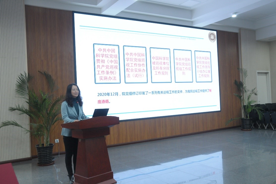 杨旭作了《巡视工作精神传达及有关工作部署》主题报告。她首先带领大家认真学习了党中央有关巡视工作的新要求,深入领会了院党组对于我院政治巡视的新部署。随后,通报了我所上次巡视后整改工作对标院巡视工作要求与巡视发现的共性问题,结合自身实际工作,开展自查自纠工作情况。最后,详细介绍了此次巡视工作的具体安排,并要求大家提前安排好工作,预留时间,积极配合院巡视组做好工作。
