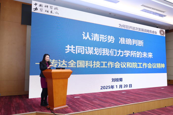 报告还专题传达了中国科学院2025年度工作会议精神。刘桂菊表示,1月16日至17日召开的中国科学院工作会议,是在中国科学院推进实施进一步全面深化科研院所改革、奋力抢占科技制高点的关键时期召开的一次重要会议,会议全面总结了2024年各项工作,并对2025年全院重点工作任务进行部署。她强调,2025年是“十四五”收官之年、“十五五”谋划之年,也是中国科学院加快抢占科技制高点的关键一年,我们要持续深入学习领会、认真贯彻落实习近平总书记重要指示批示精神和党中央、院党组重大决策部署;持续深化科研究所改革,不断优化科研组织、科技评价、收入分配等体制机制,充分发挥体系化建制化优势;积极承担完成国家重大科技任务,以高度的使命感责任感紧迫感,只争朝夕、担当实干,加快抢占科技制高点,切实承担作为国家战略科技力量义不容辞的使命责任,在实现高水平科技自立自强上做主力、当先锋。