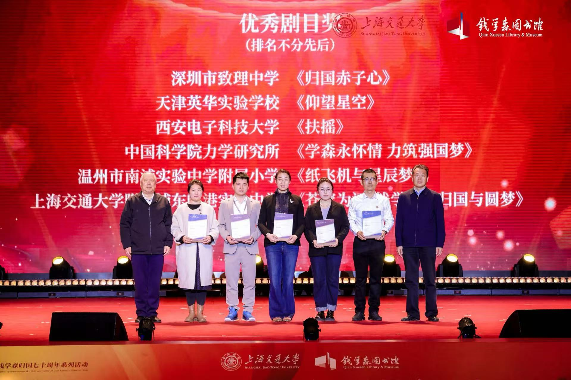 活动旨在将科学家精神从抽象符号转化为生动的科学家故事,让钱学森的理想信念、家国情怀和价值追求成为铸魂育人的鲜活教材。Q彩网申报话剧《学森永怀情 力筑强国梦》被评为优秀剧目,接受了钱学森之子、上海交通大学钱学森图书馆馆长钱永刚教授颁发的证书。