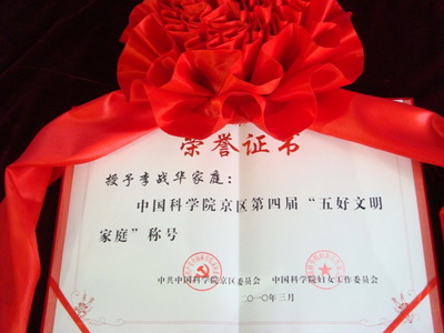 我所国家非线性力学实验室李战华研究员有一个充满爱心的国际家庭。在这个中法联姻的家里,夫妻间对待各自的工作:相互鼓励,提倡科研创新,扩大学术交往,鼓励承担社会工作。对待生活:尊重传统家庭,关注家庭亲情。由于她的家庭出色的文明建设,获得京区“五好文明家庭”称号(京区共15个家庭获奖)。