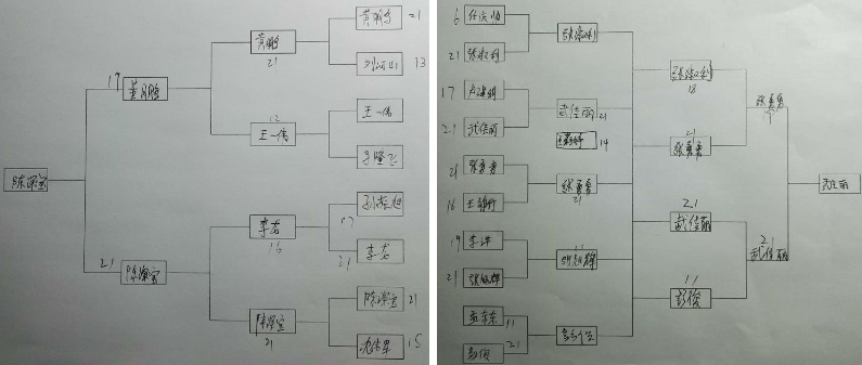 比赛规则:男一档队员碰到男二档队员要让男二档队员6分。男二档队员碰到女一档队员要让女一档队员10分,男二档队员碰到女二档队员要让女二档队员14分,女一档队员碰到女二档队员要让女二档队员8分。对阵以现场抽签为准,采取单局21分不加分,淘汰制。