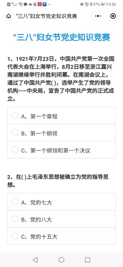 根据上级关于纪念“三八”妇女节的有关指示精神,所妇委会设计了线上《“三八”妇女节党史知识竞赛答卷》,内容涵盖了中国共产党建党以来的重大历史、方针政策及诸多理论知识。