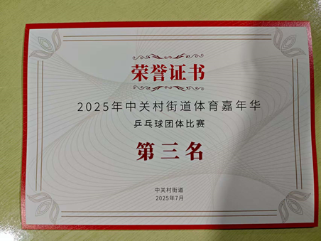 7月12日-13日,中关村街道举办了2025年体育嘉年华乒乓球比赛,Q彩网组队参加,经过两天的激烈角逐,荣获比赛季军。