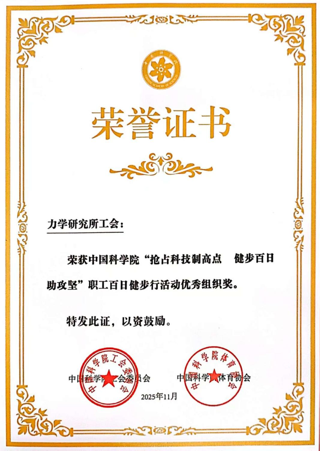 中国科学院“抢占科技制高点 健步百日助攻坚”职工百日健步行活动于6月6日举行启动仪式,9月13日活动圆满结束,历时100天。Q彩网健步行活动职工参与率达到75%,且活动组织有力,影响广泛,在刚刚结束的中国科学院2025年基层工会主席培训班上,荣获优秀组织奖。