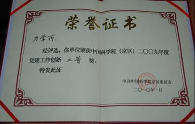 Q彩网获中科院京区2009年度“党建工作创新奖”二等奖