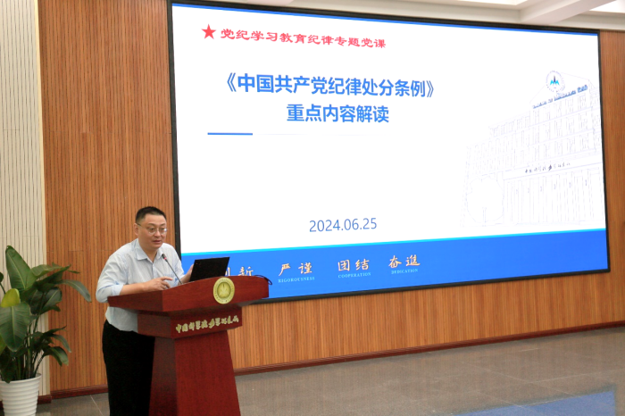 随后,仲峰泉带领大家深入学习新修订的《中国共产党纪律处分条例》(以下简称《条例》)。武佳丽作了《以案为鉴知敬畏,防微杜渐守底线》的典型案例警示教育报告。林翳聚焦于科研经费使用,作了《聚焦重点 严守党纪 管好用好科研经费》的专题报告。刘宏立作了《新版保密法及保密工作》的宣贯。科技处于双针对科技部重点研发计划申请,作了《新版重点研发计划管理办法》的宣贯。怀柔国家实验室海洋碳封存团队首席科学家、党支部书记李清平教授结合自身学习工作经历,作了《中国共产党精神谱系与科学精神的力量传承》的特邀党课。LMFS党总支书记王展作了《恪守“六大纪律” 筑牢思想根基》的党纪学习教育专题党课。