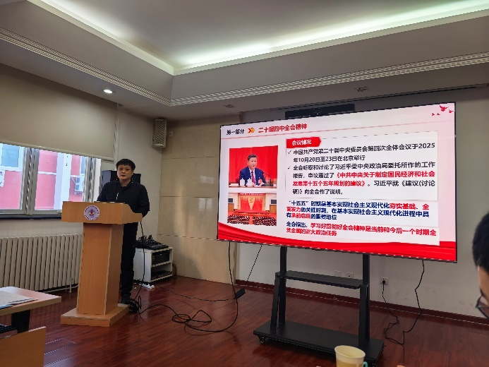 首先,魏炳忱作《学习贯彻党的二十届四中全会精神》专题报告。他指出党的二十届四中全会聚焦研究制定“十五五”规划,系统回顾新中国成立以来各项五年计划与规划实施所取得的重大成就,深刻揭示了中国特色社会主义制度在持续推进社会主义现代化建设中的显著优势。报告重点解读了党的二十届四中全会公报重要内容,深入阐释了习近平总书记关于“十五五”规划建议说明的核心要义。
