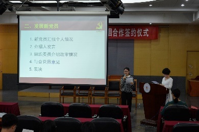 首先,支部根据对入党积极分子的考察情况,讨论发展4名研究生为预备党员事宜,他们分别是研究生一支部曹高辉同学、刘海娇同学和谢益芹同学、研究生二支部李丹同学。四名积极分子向党组织宣读了他们的入党申请书,汇报了个人情况,入党动机和思想觉悟。入党介绍人也分别介绍了他们的日常表现和积极向党组织靠拢的决心。接下来,支部委员分别介绍了积极分子的政审情况。最后,参会党员以不记名投票的方式对入党积极分子加入党组织进行表决,同意发展曹高辉、刘海娇、谢益芹和李丹四位同学成为中共预备党员。