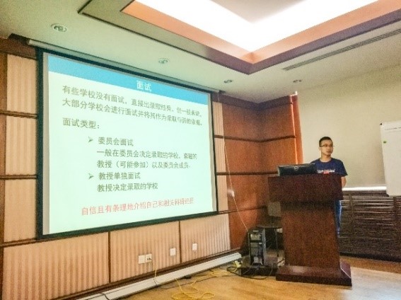 在毕业生交流环节中,韩懂同学根据自己的经验,为大家介绍了出国的前期调研,需要准备的材料和具体的申请过程。报告内容充实,有借鉴性,为准备出国的同学增添了信心。王为同学分享了自己在找工作过程中对于航天院所的调研,并传授了面试过程中的注意事项和心得体会,为同学们找工作提供了指导。