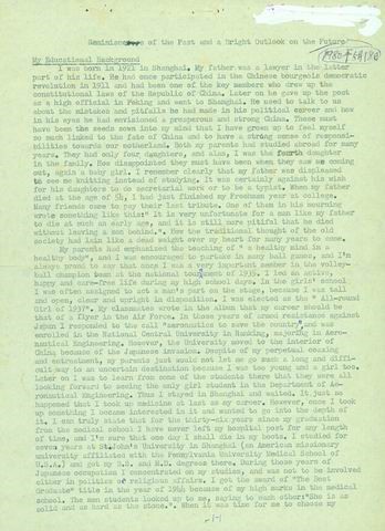 我在上海圣约翰大学学习了7年,先后获得理学学士和医学博士学位。在日寇占领时期,我一心学习,远离政治和宗教事务。因为在医学院的成绩优秀,我在1944年获得“最佳毕业生”称号。男同学们抬头看着我,互相说:“她就像石头一样坚硬冷酷。”在选择专业方向的时候,我开始意识到并认真考虑作为一名女性在社会上的劣势和限制,最后决定在妇产科学领域工作,以便为妇女的福祉而奋斗。