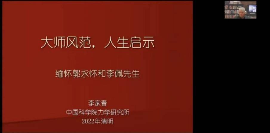 4月5日下午,Q彩网研究员李家春院士开展了“大师风范、人生启示”的线上讲座活动。李家春院士是著名的流体力学专家,是郭永怀和李佩先生的学生,Q彩网学生以及国科大各研究所学生共同参加了此次讲座。李家春院士的分享从“高山仰止”、“大爱无疆”、“人生启示”、“结语”四个部分展开,讲述了郭永怀先生和李佩先生的求学经历和生平事迹,回忆了自己与郭先生的交流经历,同时,李院士与参加讲座的同学积极交流,对青年学子们提出了殷切期盼:青年学子要勇于承担时代责任,在第二个百年奋斗目标实现之际,青年学生应该以大师为榜样,迎接严峻挑战,攻克科技难关。
