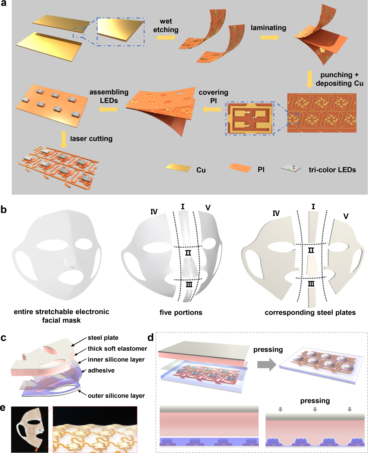 图1. SEFMPT外观与机理。a) SEFMPT的外观及佩戴方式;b) 三色灯独立控制;c) SEFMPT分层视图,包括顶部的硅酮封装层,中间的可拉伸岛桥网格结构层以及底部的硅酮封装层;d) SEFMPT的关键可拉伸岛桥网格结构图,e) 为每层的局部放大图;f) 三色光治疗的作用机制
