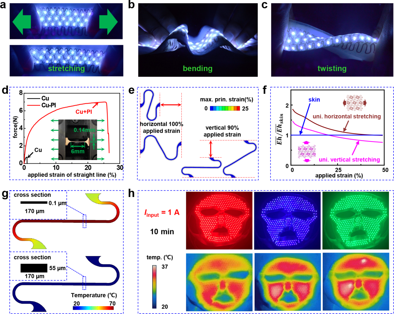 图3. SEFMPT的大变形。a) 拉伸,b) 弯曲,c) 扭曲;d) 单层Cu和Cu-PI复材结构的力-加载应变曲线;e) 单轴拉伸至100%和90%应变时Cu-PI复材结构的应变分布;f) 单轴水平和垂直拉伸时器件对人体皮肤的相对拉伸刚度;g) 两种不同截面尺寸下典型蛇形Cu连线中的温度分布;h) 环境温度为20℃、输入1A电流10min时SEFMPT内部温度分布