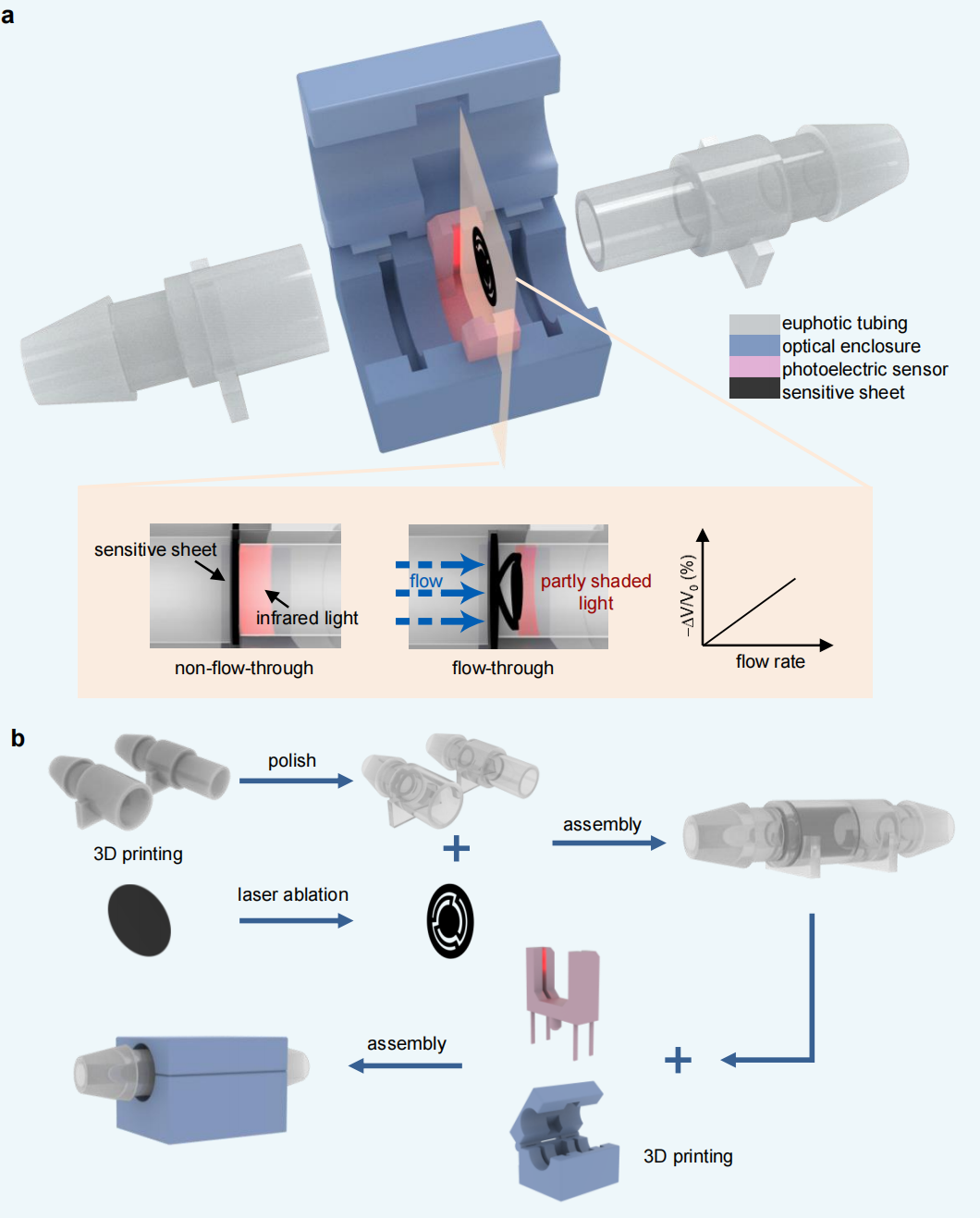 图1基于FPCBS的光电式流速传感器的设计与制备工艺。(a)基于FPCBS的光电式流速传感器示意图。插图:基于FPCBS的光电式流速传感器的传感原理简图。(b)基于FPCBS的光电式流速传感器的制备工艺。