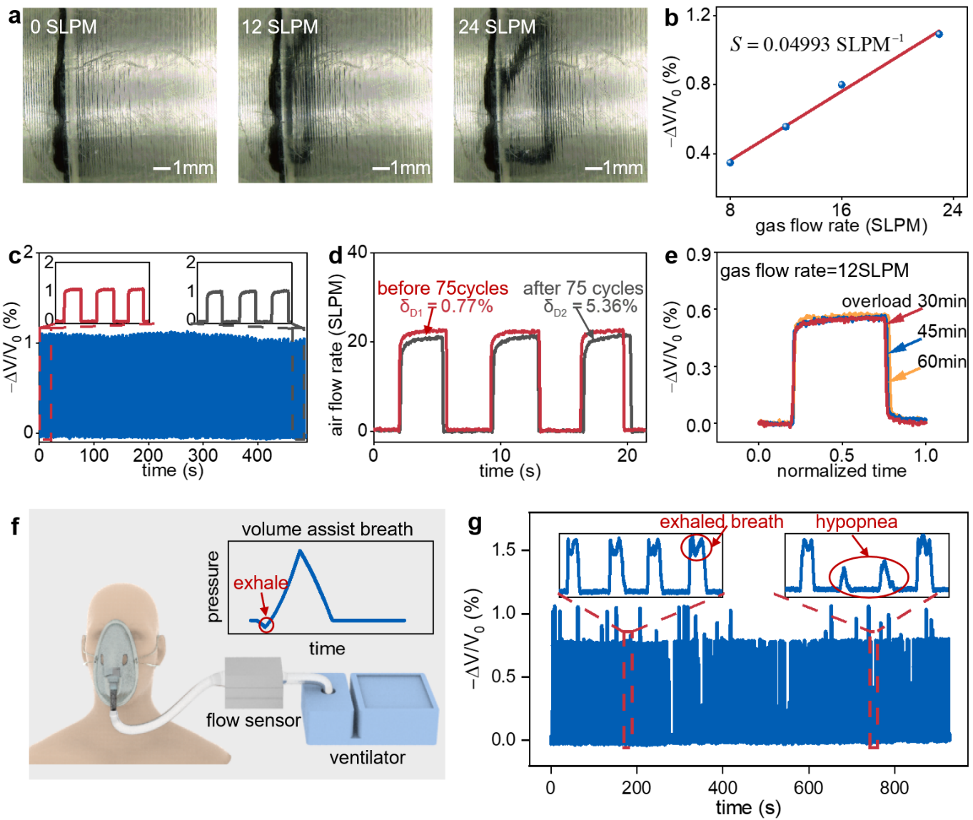 图3流速传感器检测气体流速的性能和应用。(a)不同气体流速下敏感薄片的光学图像。(b)流速传感器的相对电压变化与气体流速的关系。(c)在气体流速为23SLPM(标准升每分钟)下,反复加载和卸载75个循环时的相对电压变化。(d)前三个周期和后三个周期耐久性误差的比较。(e)将流速传感器置于强气流下不同时间后,在气体流速为12SLPM时,流速传感器的相对电压变化。(f)将流速传感器应用于家用呼吸机。插图:容积辅助呼吸模式的压力曲线。(g)呼吸引发的相对电压变化。