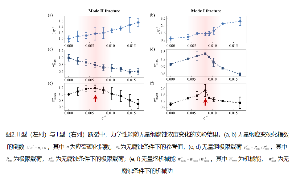 研究揭示了一种在不同断裂模式下普遍存在的化学增韧效应。在一定腐蚀强度下,腐蚀引发的应力释放与塑性增强可部分抵消强度退化,使结构韧性反而提升。这表明,腐蚀不仅是“破坏源”,在特定条件下也可能成为“增韧因子”,为极端环境下的结构优化设计提供了新的理论指导。