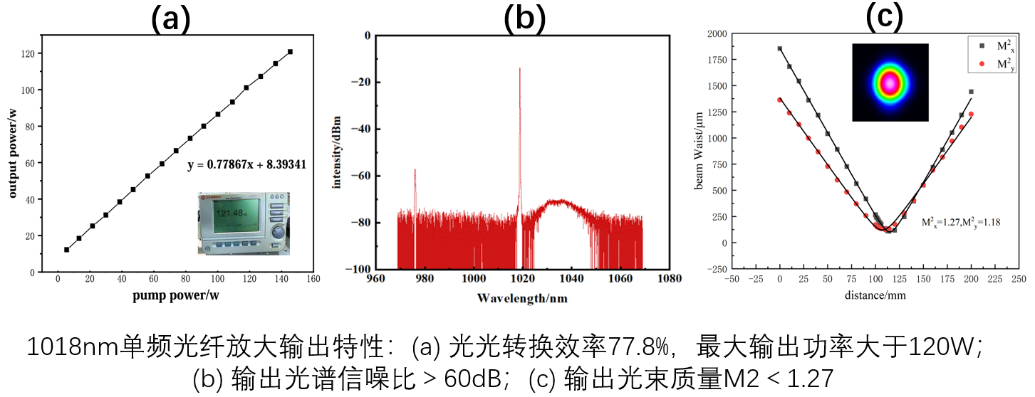 通过采用光纤放大方案,将单频1018nm放大到120W(目前为止1018nm单频激光最高输出功率),且具有良好的光束质量和噪声特性,为后续高功率509nm倍频提供的坚实的基础。相关研究成果发表在OPTICS LETTERS和IEEE Photonics Journal,引力波实验中心李磐高级工程师为第一作者和通讯作者。研究获得了科技部重点研发计划(2021YFC2201803)的资助。