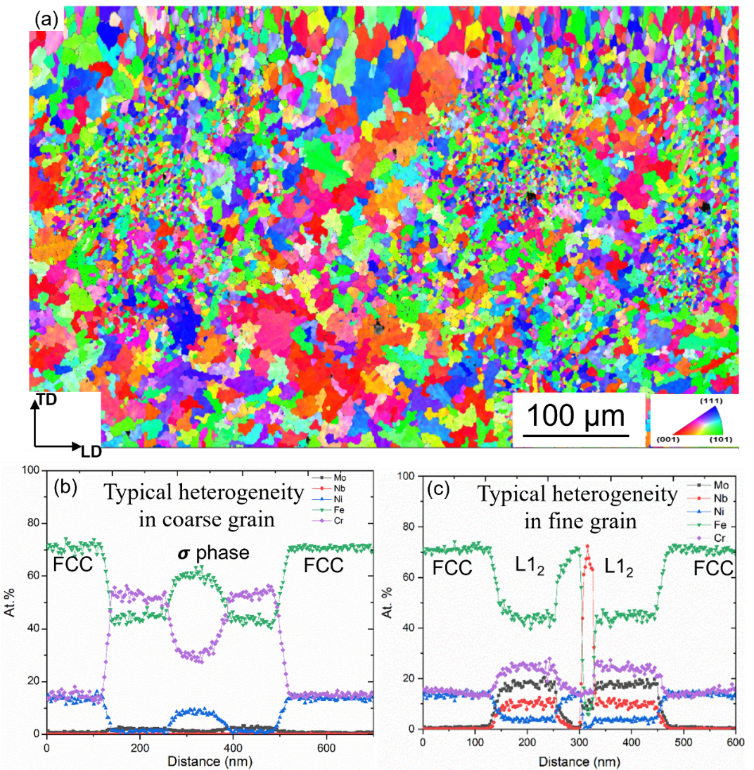 本研究通过耦合超声增材制造,制备了异质结构316L不锈钢,该合金呈现出跨尺度的层级微观结构,其范围涵盖毫米级晶粒、微米级胞结构以及分布于胞壁中的Fe-Cr σ相与L1₂纳米析出相层级梯度微结构。本研究揭示了跨尺度与化学成分扰动的独特胞结构特征,明晰了多级孪晶与亚稳态胞状结构对位错滑移的协同效应的作用机制。层级异质结构316L不锈钢实现了抗拉强度高达1 GPa的同时,保持约12.5%的延伸率。本研究通过激光增材制造结合超声技术实现了可控多级异质微观结构的调控,为微结构设计与制造开辟了新途径。
