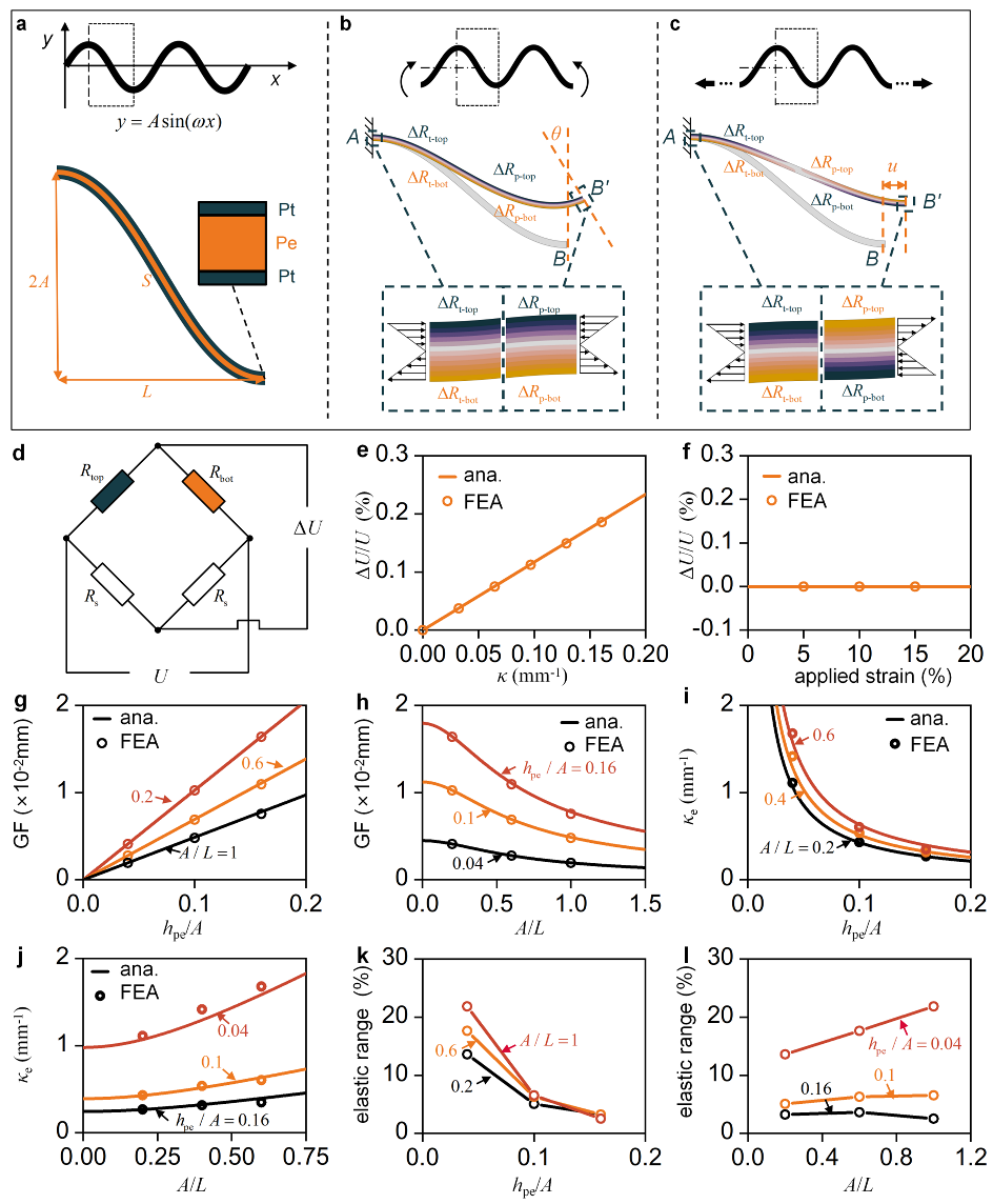 该曲率传感器的核心在于其创新设计的 WSSLS 结构。该结构由上下对称分布的波浪形金属导电层与波浪形聚乙烯基底组成,并通过柔性封装形成整体器件(图1)。不同于传统单侧波浪结构在拉伸或弯曲过程中不可避免地产生弯拉耦合响应,WSSLS 利用几何对称性与双层响应差异,在弯曲加载时产生同幅值异符号的应变响应,而在拉伸加载时产生相互抵消的对称变形,从而在电信号层面实现弯曲信号的纯输出(图1d)。针对波浪形三维导电结构难以稳定制备的问题,研究团队提出了一种曲面光刻(Curved Surface Lithography)工艺,将传统平面光刻与热塑成型相结合,在曲面基底上直接制备无初始应力的波浪形金属导电层(图1c)。该方法有效避免了先金属成形后弯曲成波浪过程中产生的裂纹与失效问题,显著提升了器件的一致性与可靠性。在理论分析方面,研究团队建立了 WSSLS 的力电耦合模型,系统推导了传感器输出信号与曲率之间的解析关系,明确揭示了几何参数对灵敏度和弹性范围的影响(图2)。有限元模拟结果与理论分析高度一致,验证了模型的准确性与适用性。实验结果表明,该传感器在弯曲加载下呈现出高度线性的电学响应,而在拉伸加载下输出信号几乎不发生变化,充分证明了其弯拉解耦特性。在性能验证中,该曲率传感器展现出优异的综合性能,包括高线性度、高重复性和快速动态响应。器件能够分辨低至0.004 mm-1的微小曲率变化,并在 2000 次以上循环加载过程中保持稳定输出(图3)。同时,由于其对称结构特性,传感器还具备压力和温度自补偿能力,在外界压力和温度变化条件下仍可维持准确的曲率测量。在应用展示方面,研究团队将该传感器集成至智能手套中,用于实时获取手指关节曲率并进行手势识别(图4a)。在模拟皮肤-织物界面摩擦与滑移的条件下,与传统可拉伸应变传感器相比,该曲率传感器的测量误差降低了93.6%,显著提升了穿戴场景下的可靠性(图4b,c)。基于该系统,研究人员实现了对六足机器人和机械手的手势控制,验证了其在复杂人机交互与远程操作中的应用潜力(图4d-g)。