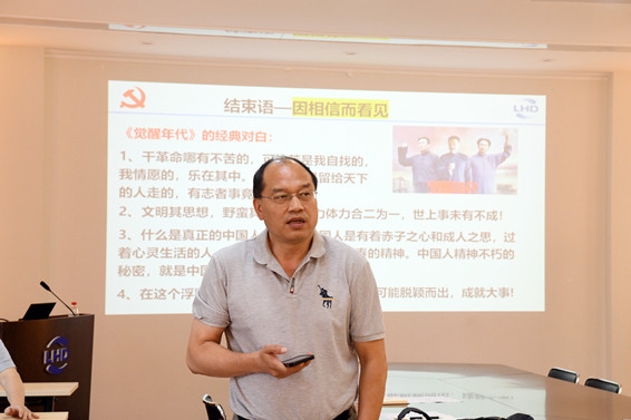 党总支书记\LHD一支部党支部书记赵伟作了题为《学党史鉴往知来,找初心行稳致远》的党课报告,他以“觉醒年代”为引子,回顾了从建党初期的筚路蓝缕到今天领导中国人民开创中华民族伟大复兴的艰苦奋斗历程。中国共产党人坚持信仰,完成了从建党到建国的征程,体现了因相信而看见;建国后,历经坎坷,勇于革新,强国富民,使中华民族屹立于世界东方,体现了因看见而相信。党课概述了“道路自信”建立过程中的几个伟大历史时刻。他号召每位党员扎实开展党史学习教育,涵养家国情怀,忠诚党和人民;激发担当意识,发扬主人翁精神;既要仰望星空也要脚踏实地,做到青春无怨无悔。