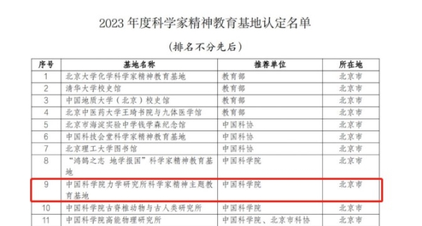 力学研究所入选全国“科学家精神教育基地”